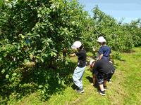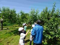 今回は、いくつか実った玉から中心の大きな実を残す摘果作業です。コツをおぼえてどんどん作業を進めていました。